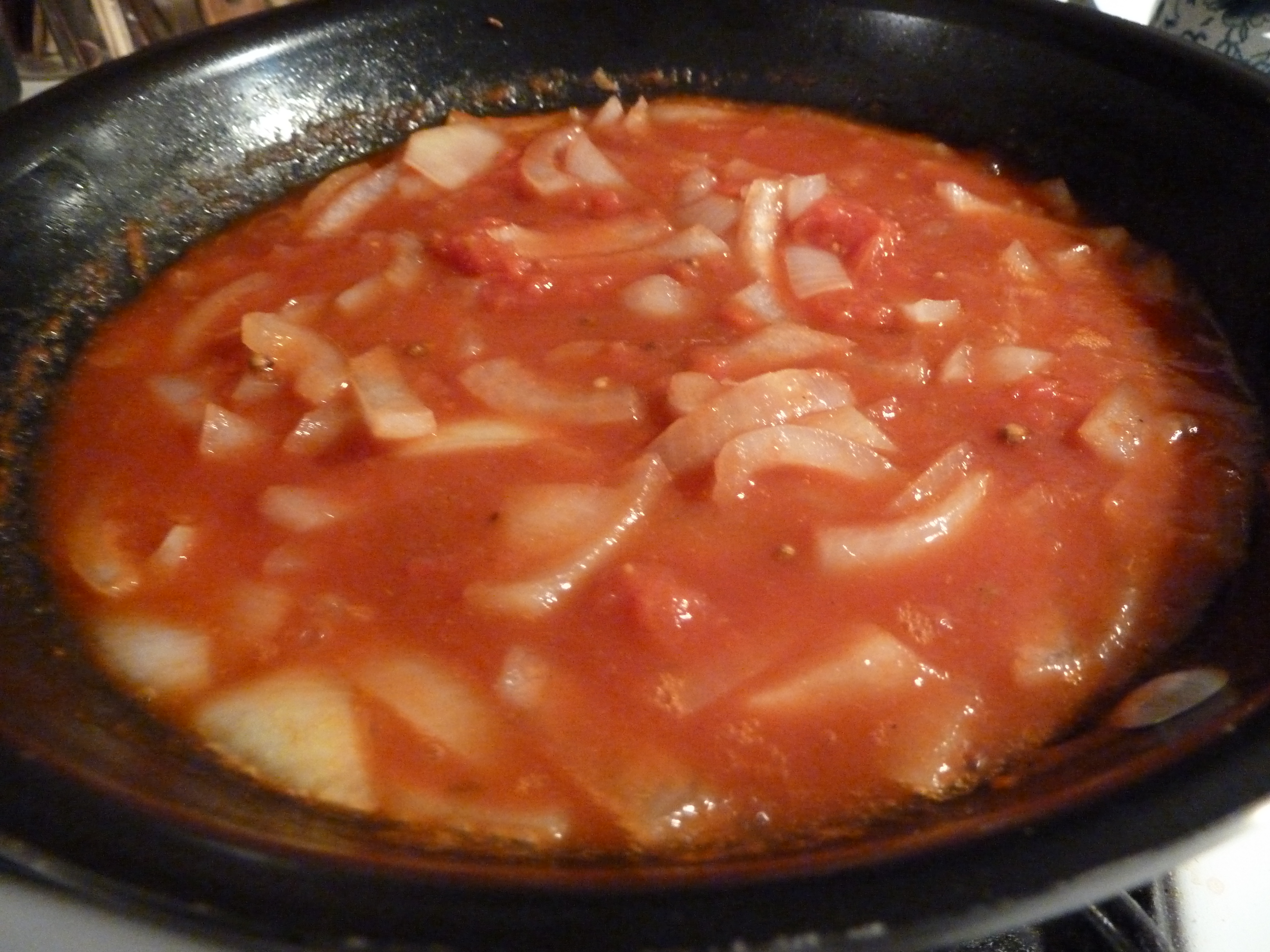 Slice onion into 2″ strips. Using your hands, crush the whole tomatoes into a bowl, saving the juice.