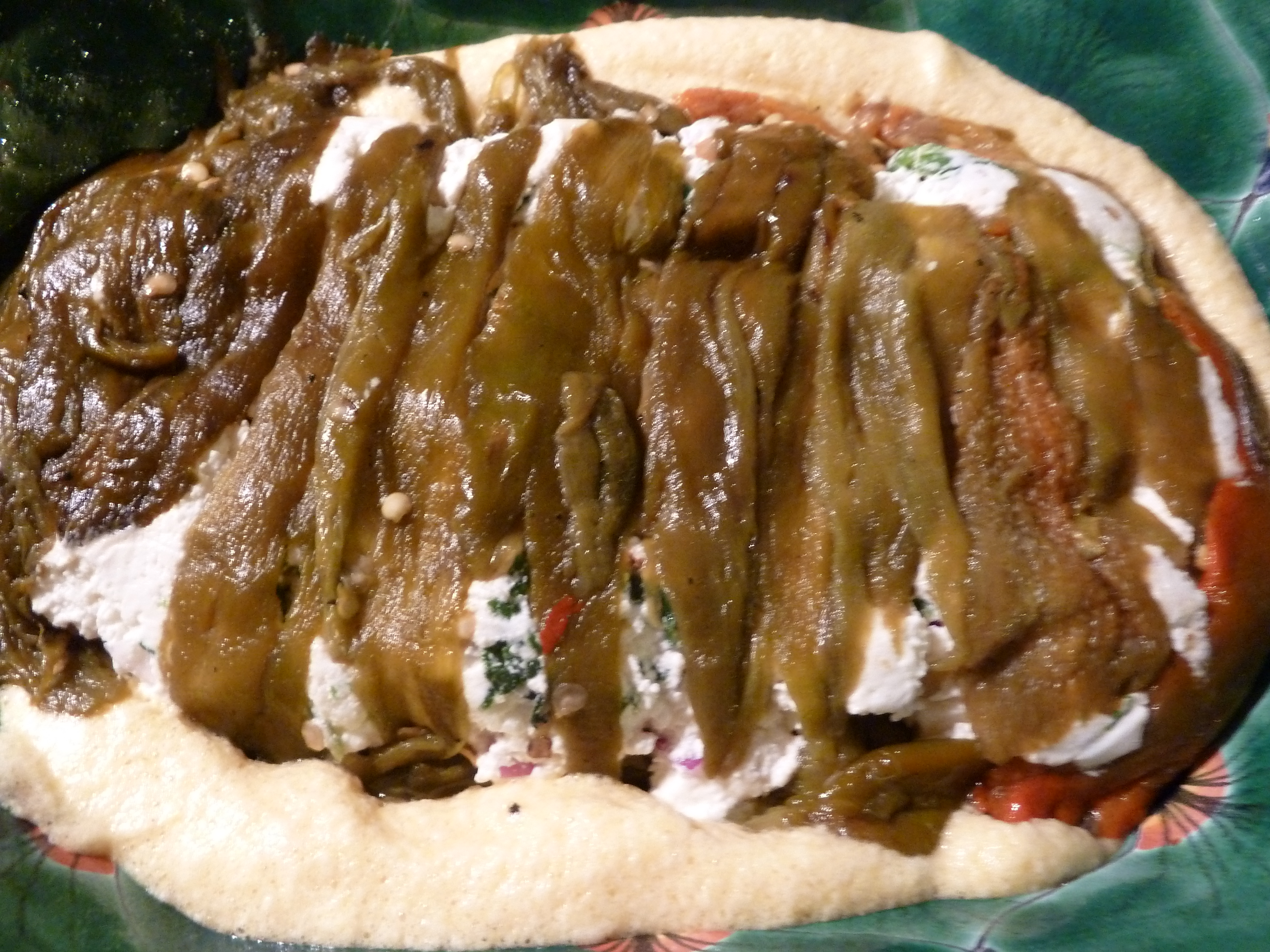 Apart from the name, this recipe has nothing to do with what they were doing. This is a hybrid between my mom’s chile rellenos, which she stuffed with a much lighter cheese mixture using fresh ricotta and onions, and my friend Linda Fry’s ingenious recipe which makes the whole thing into a baked casserole and avoids the nastiness of deep frying. Served with a Warm Tomato-Coriander Salsa, it is fresh and heavenly.
