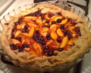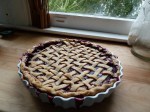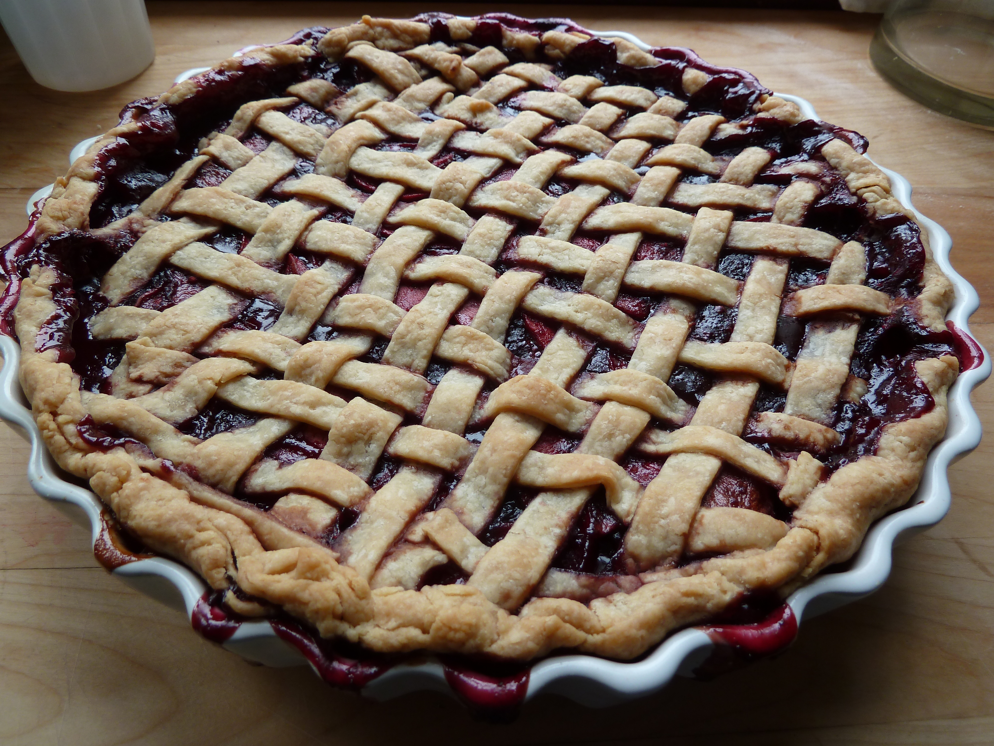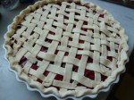 Gently roll lattice top onto a rolling pin, transfer to top of fruit mixture and carefully unroll onto tart. Flute lattice and tart edges together and bake for 10 minutes in 425° oven. Turn oven down to 350° and continue baking for 1 hour until top is gently brown all over. Make sure there is a pan with foil at the bottom of the oven to catch the drips. Enjoy!