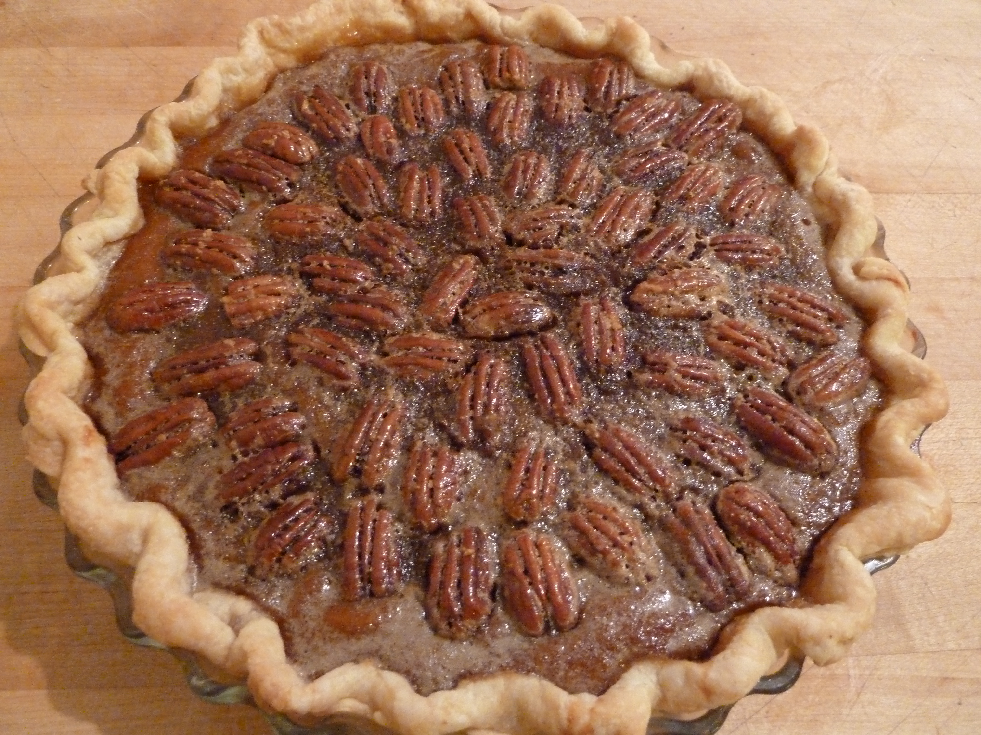 Top with Pecan Slime: Combine syrup, eggs and spices. Add pecans. Carefully spoon liquid over pumpkin filling in shell and then hand place slimy pecan halves on top in a decorative pattern.