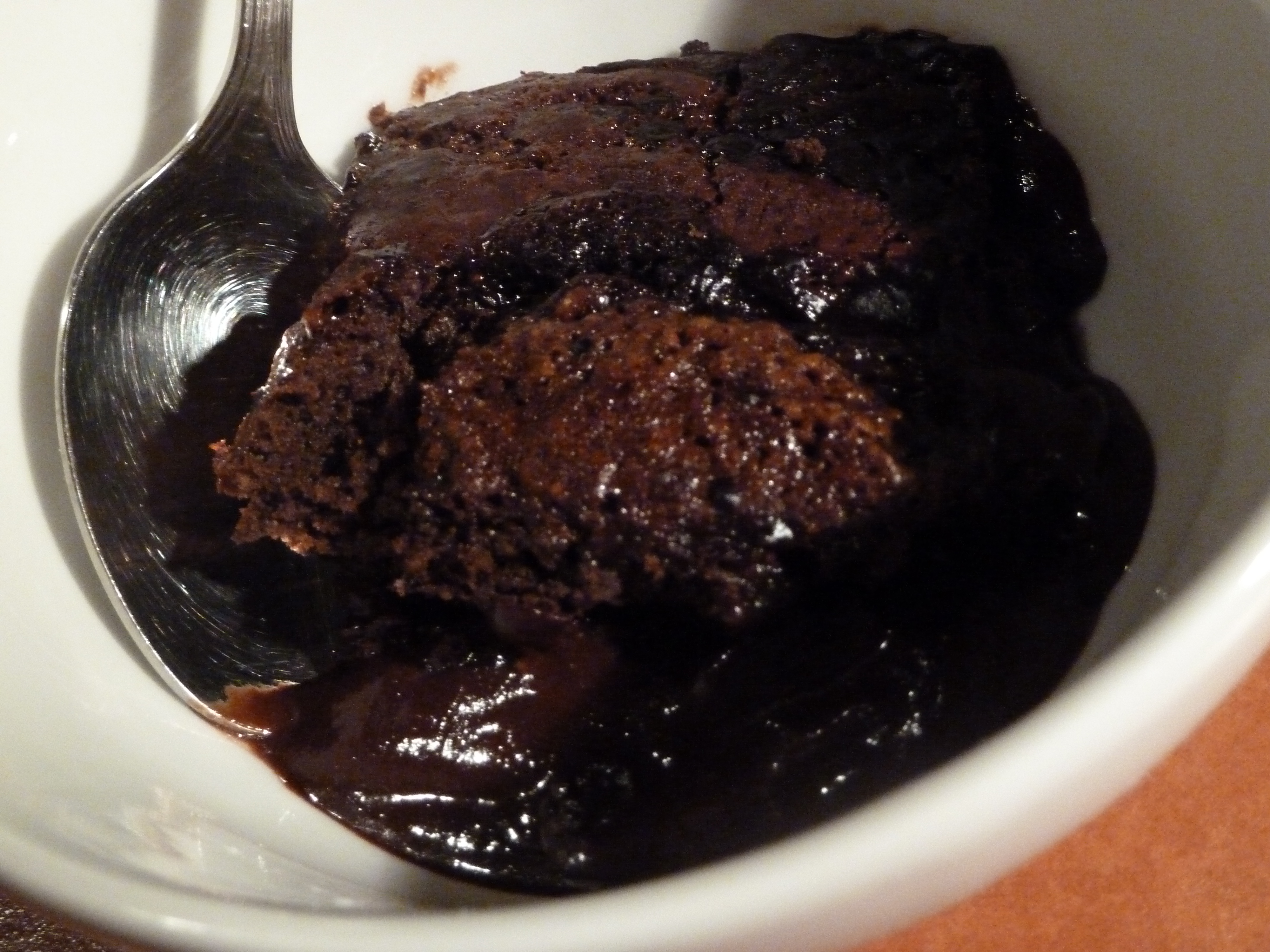 This is a low-gluten, vegan version of the old fashioned “pudding cake” recipe, in which you mix the base batter up in a baking pan, sprinkle with sugar and cocoa, top with boiling water and bake. As it bakes, it separates into a bottom pudding layer and a top cake layer. Ugly, but super simple and homey and fun! Serve warm in bowls with freshly whipped cream or cashew cream to evil it up!