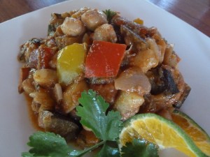 Jamie Oliver calls Tagine “a sort of stew with attitude”… which sums it up pretty well, I think. “Tajine” is actually the Berber word for the earthenware pot this stew is traditionally slow-cooked in, but any heavy-bottomed pot will do the trick. While there are endless varieties, Morrocan Tagine is typically made with lamb, chicken and vegetables, dried fruits, cinnamon and other spices, and served over couscous. Replacing the meat with chickpeas and eggplant makes for a completely satisfying and delicious stew which in the hot Costa Rica climate, we served over a room temperature barley and toasted almond pilaf.*