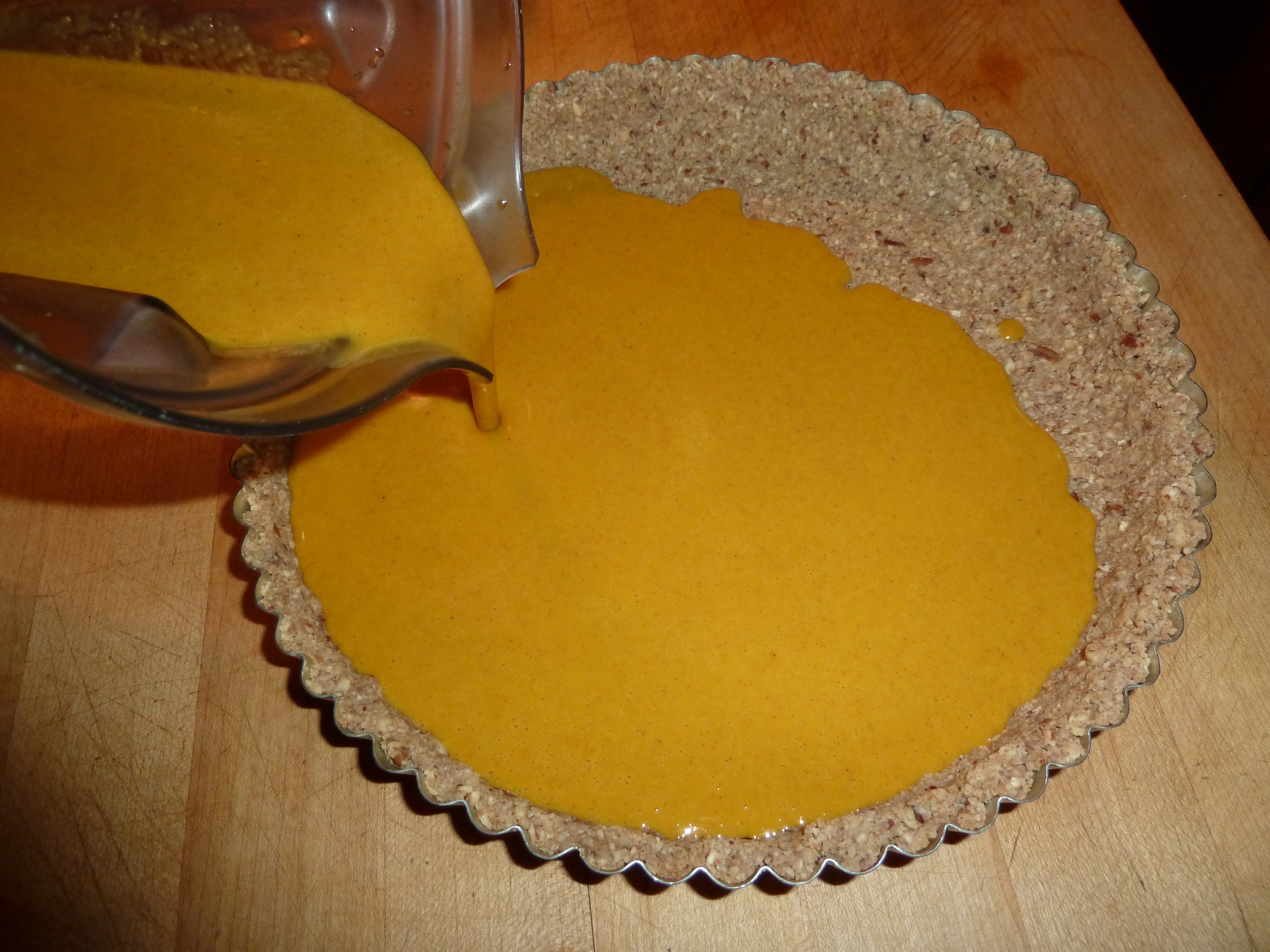 As promised, here is the raw and still-pretty-rich but much better for you version of the evil Pecan Pumpkin Tart. The “pumpkin custard” which is actually not made with pumpkin at all, is a lightened up version of Matthew Kenney’s Pumpkin Tart with Thyme, found in his cookbook Everyday Raw. This tart requires a couple of days to get all the elements together, but once you have everything it is actually very easy to make and can be done a day in advance. Don’t tell anyone one it is not actually pumpkin, or that it’s raw, until after they have tried it. They will never guess!
