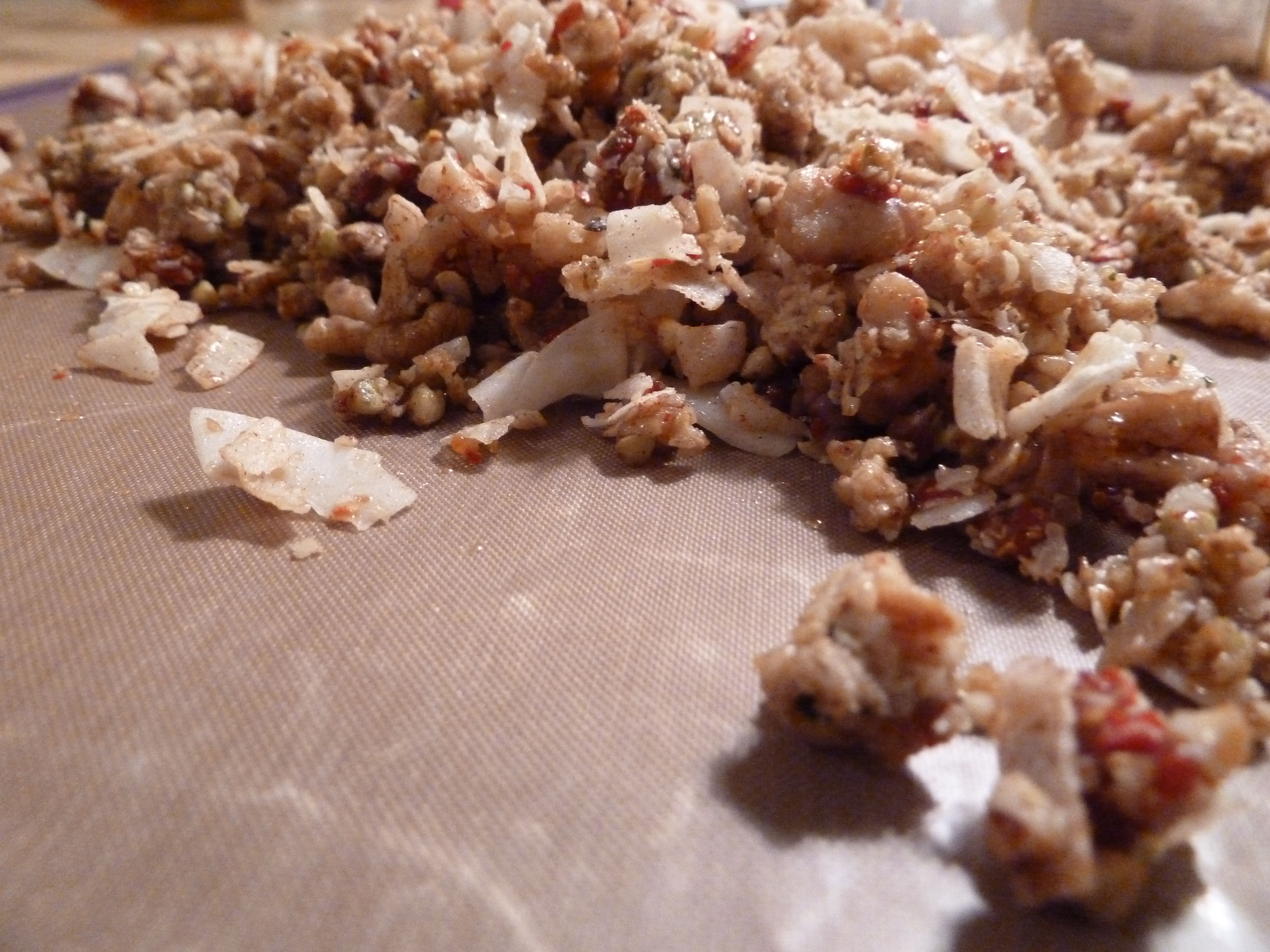 Spread out on 4 Perflex sheets and dehydrate 8 – 12 hours at a low temp (108°). Turn the mixture over once to expose any damp spots so everything is uniformly dry as possible.