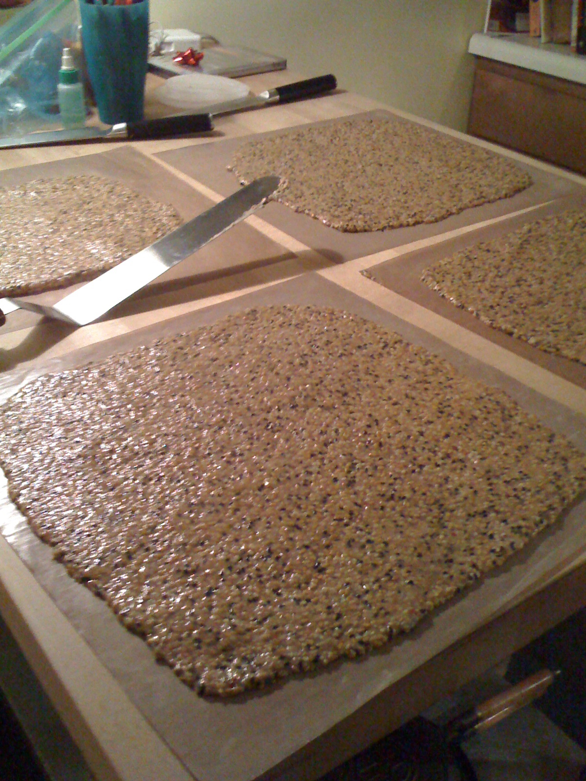 Blend 3 cups of the soaked mixture (make sure you get the chipotles in there) in a blender or food processor for a couple of minutes. Add 1/4 cu sesame oil and up to a cup of water as necessary to keep things moving. The idea is to break up some of the flax and sesame to make it more digestible and give a nice cracker base, but not to make it a homogenized pulp. Flecks are good.